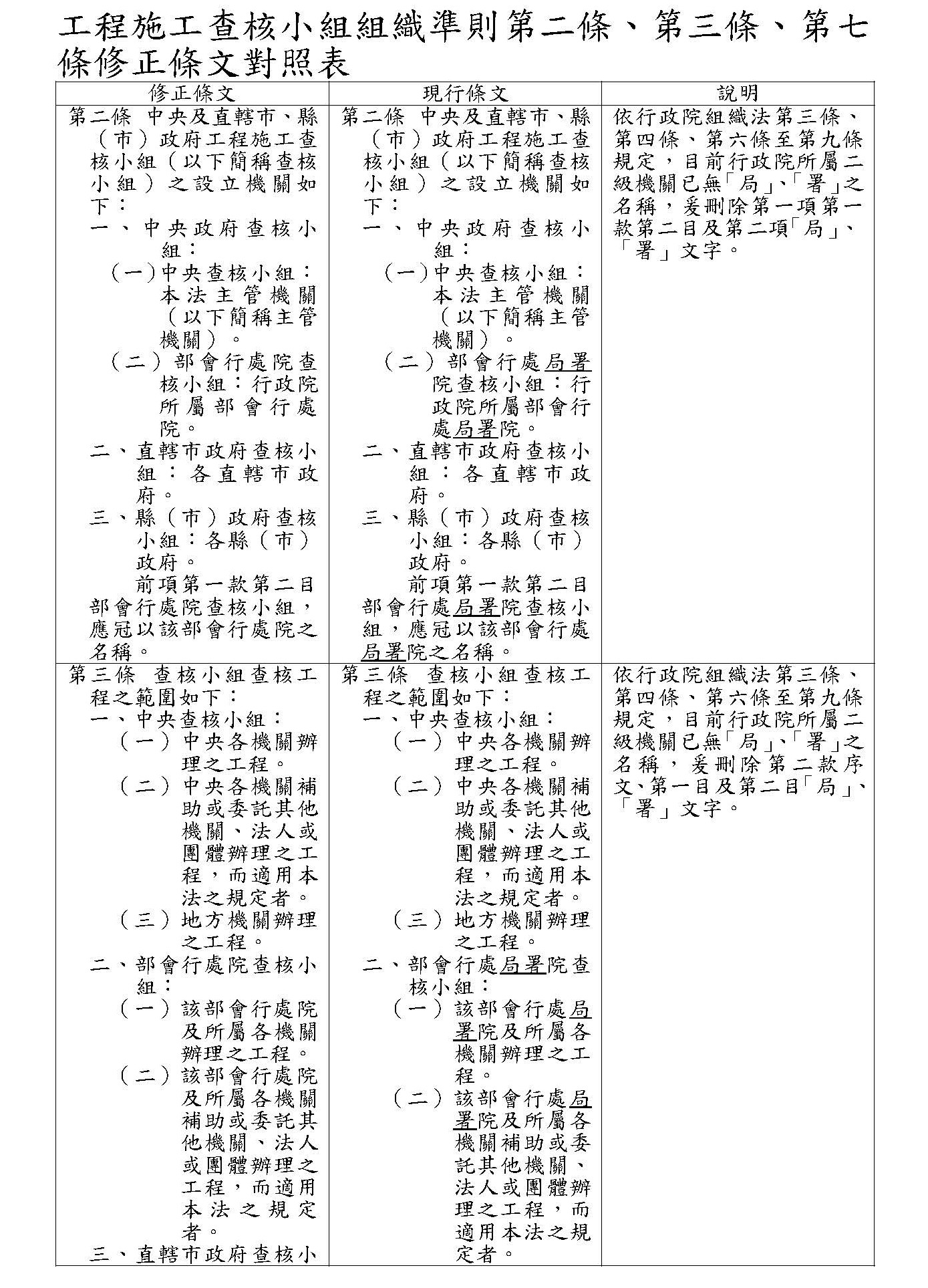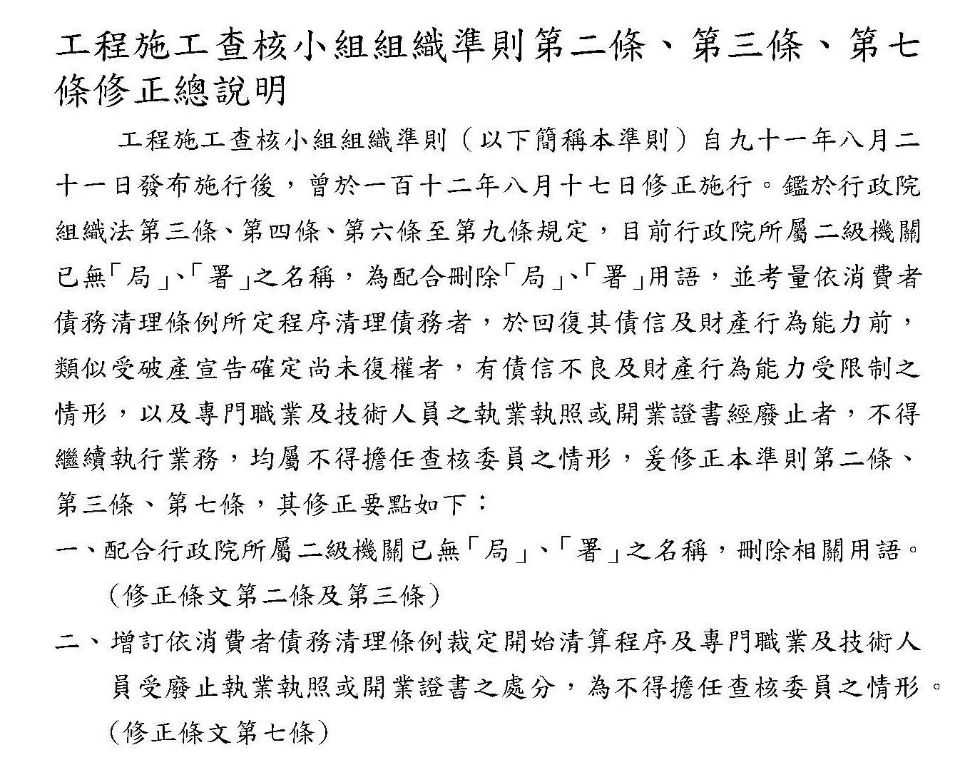標題:臺北市建築管理處函轉行政院工程會114年10月15日工程管字第1140024705號令修正發布「工程施工查核小組組織準則」第2條、第3條、第7條,檢送相關函文、發布令影本、修正總說明及條文,詳請內閱。