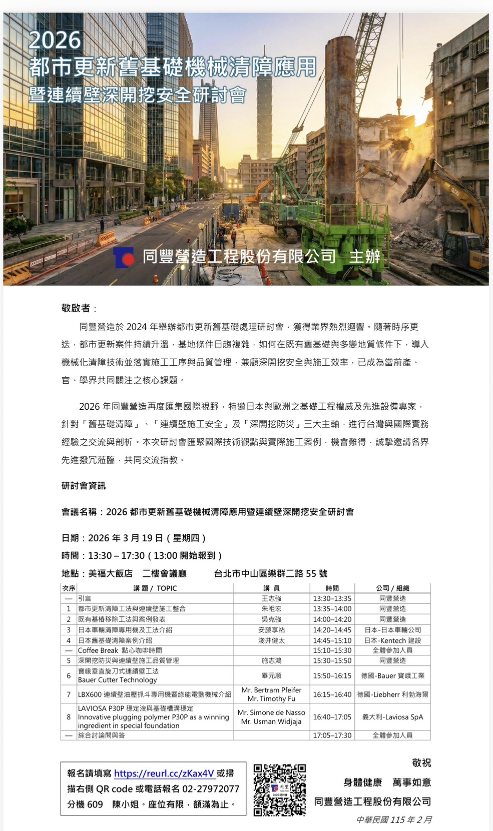 標題:同豐營造工程股份有限公司訂於3月19日(星期四)下午在美福飯店辦「2026 都市更新舊基礎機械清障應用暨連續壁深開挖安全研討會」,詳請內閱。